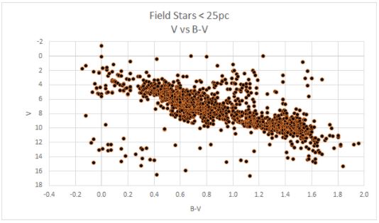 In this project, I analyzed data from three star clusters (stars in a cluster are the same approximate distance from Earth and relatively “close to” one another, so it can be assumed those stars formed at the same time and are approximately the same age). I also analyzed data from all ‘field stars’ that are within a 25 parsec radius of the Sun, accounting for roughly 1300 stars. Although these stars are all closer than those in the the clusters, they are individually at different distances, and therefore I had to make a correction for each star’s distance independently.