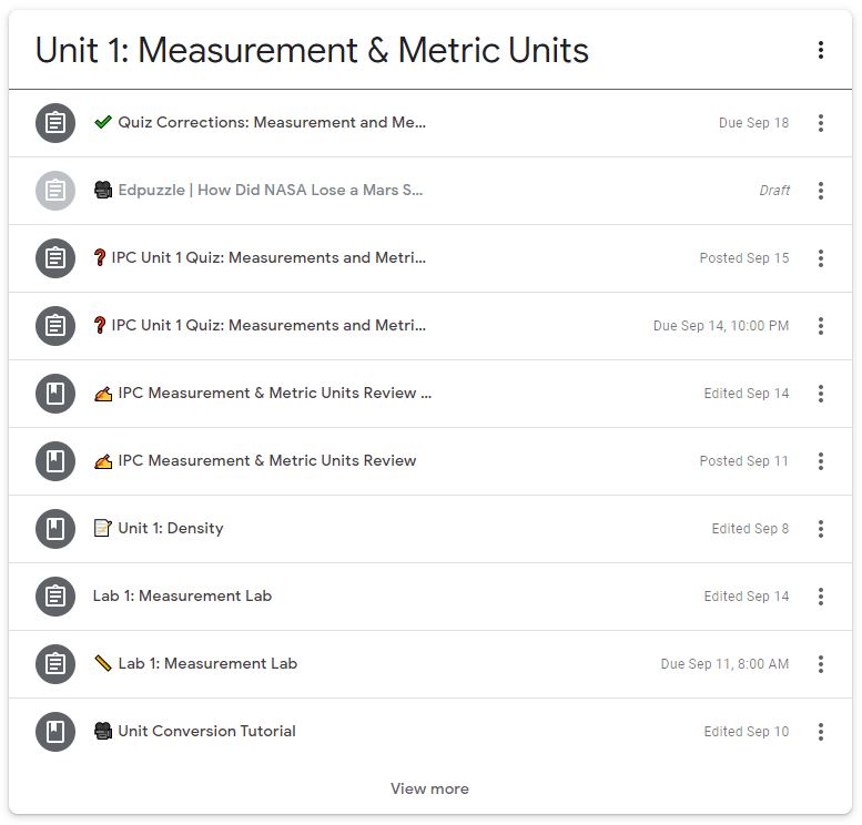 To streamline communication in this current digital venue, I have structured my Classroom into a separate unit for each major topic explored in class. A typical unit will likely be two to three weeks in duration, and I typically post an assignment or resource for every class period. To help students differentiate between posts at a glance, I have implemented a system of emojis that reflect the type of material included in that post.
